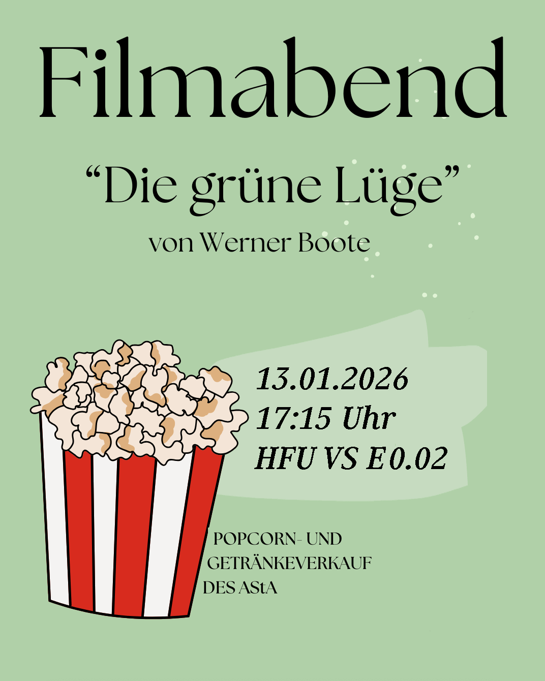 Freuen Sie sich auf Popcorn und Getränke vom AStA der HFU in gemütlicher Atmosphäre. Gerne können Sie Ihre eigene Schüssel für das Popcorn mitbringen.