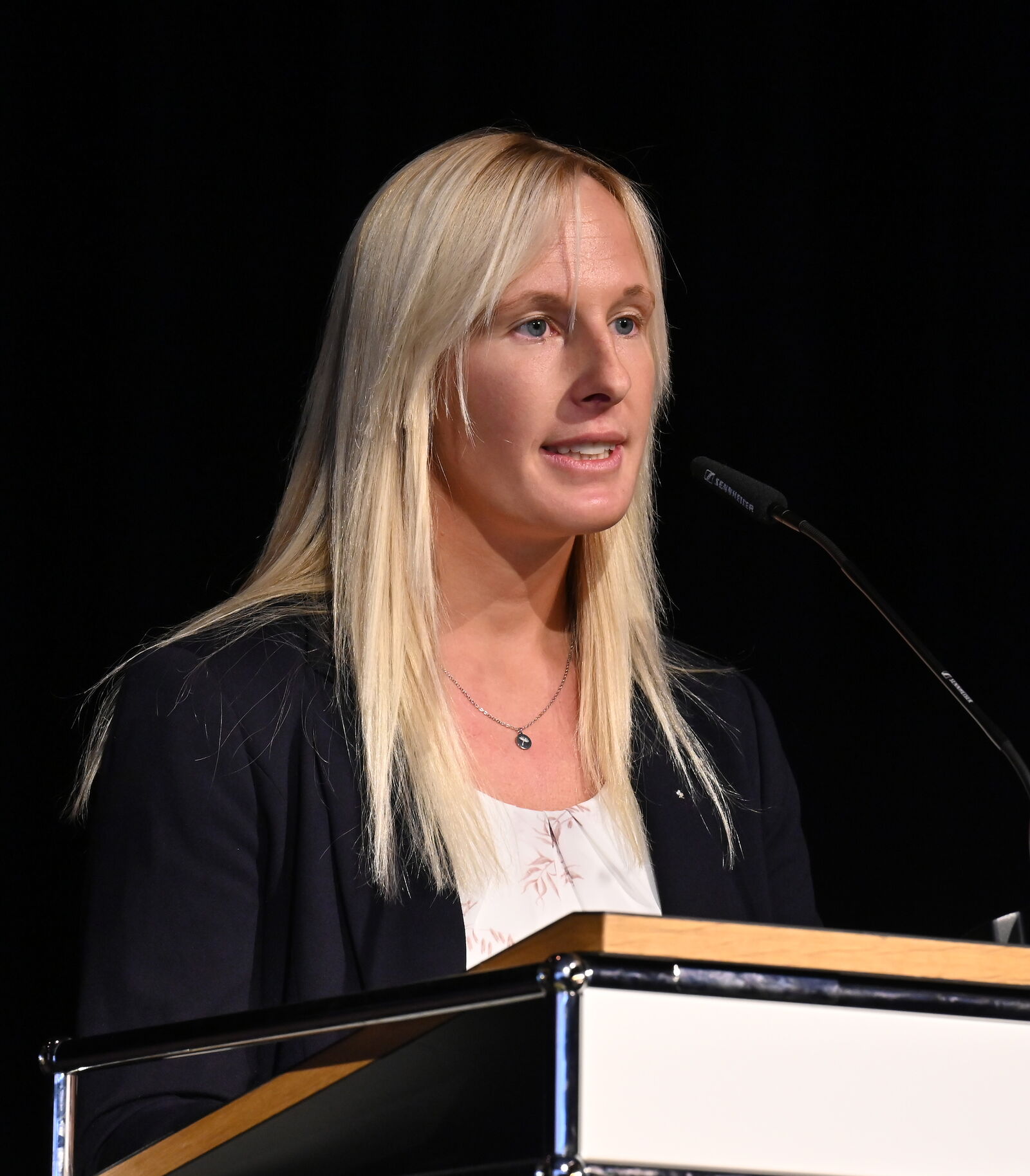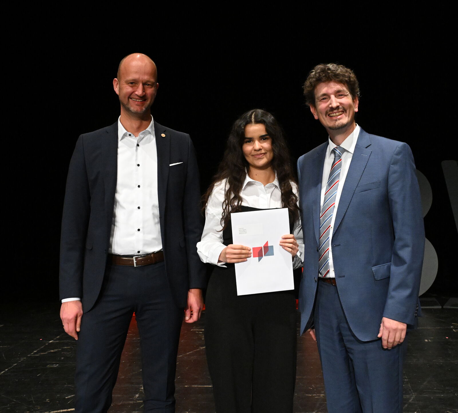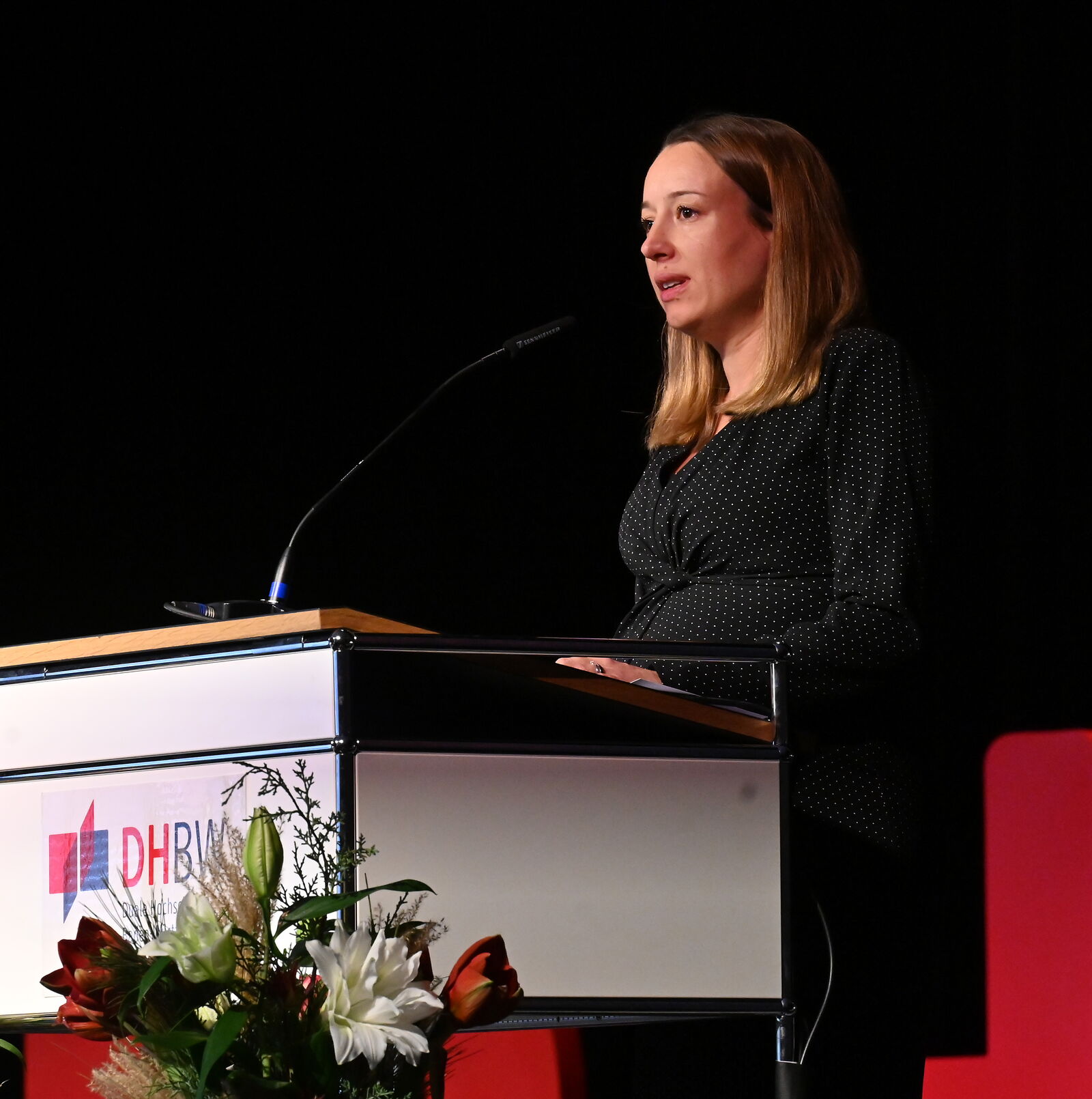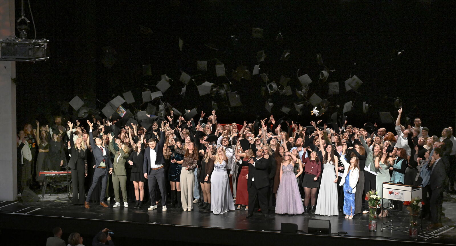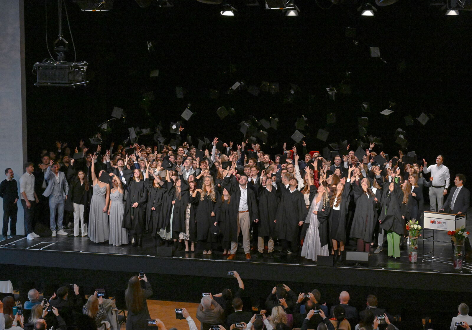 Inspirierende Impulse kamen von Alumni der vergangenen Jahre. Daniel Hug, Geschäftsführer der Herbert Waldmann und Co. KG, riet den Graduierten, ihre Netzwerke zu pflegen und der DHBW verbunden zu bleiben. Désirée Konrad, Vorständin Finanzen im STO Management, erinnerte an die Stärke der DHBW-Gemeinschaft: „Erfolg entsteht im Miteinander.“ Katharina Maurovich, Ausbildungs- und Studienleiterin Personalmanagement der AOK Baden-Württemberg, betonte die gesellschaftliche Bedeutung des Engagements der jungen Akademikerinnen und Akademiker.