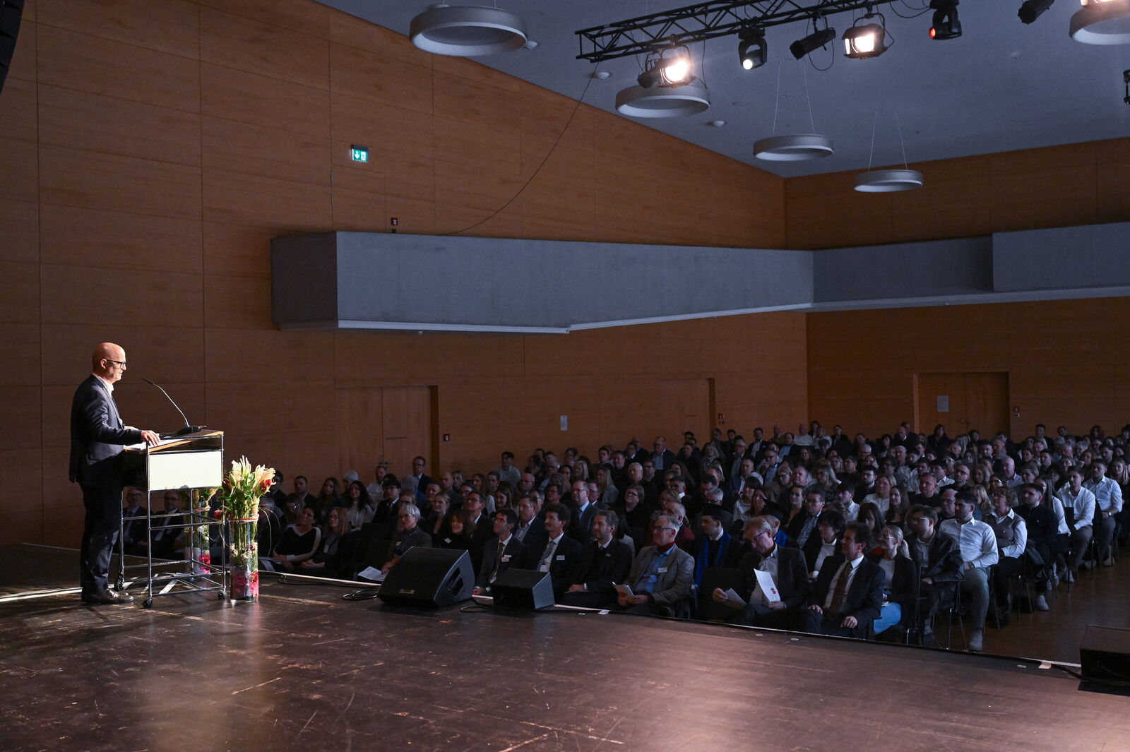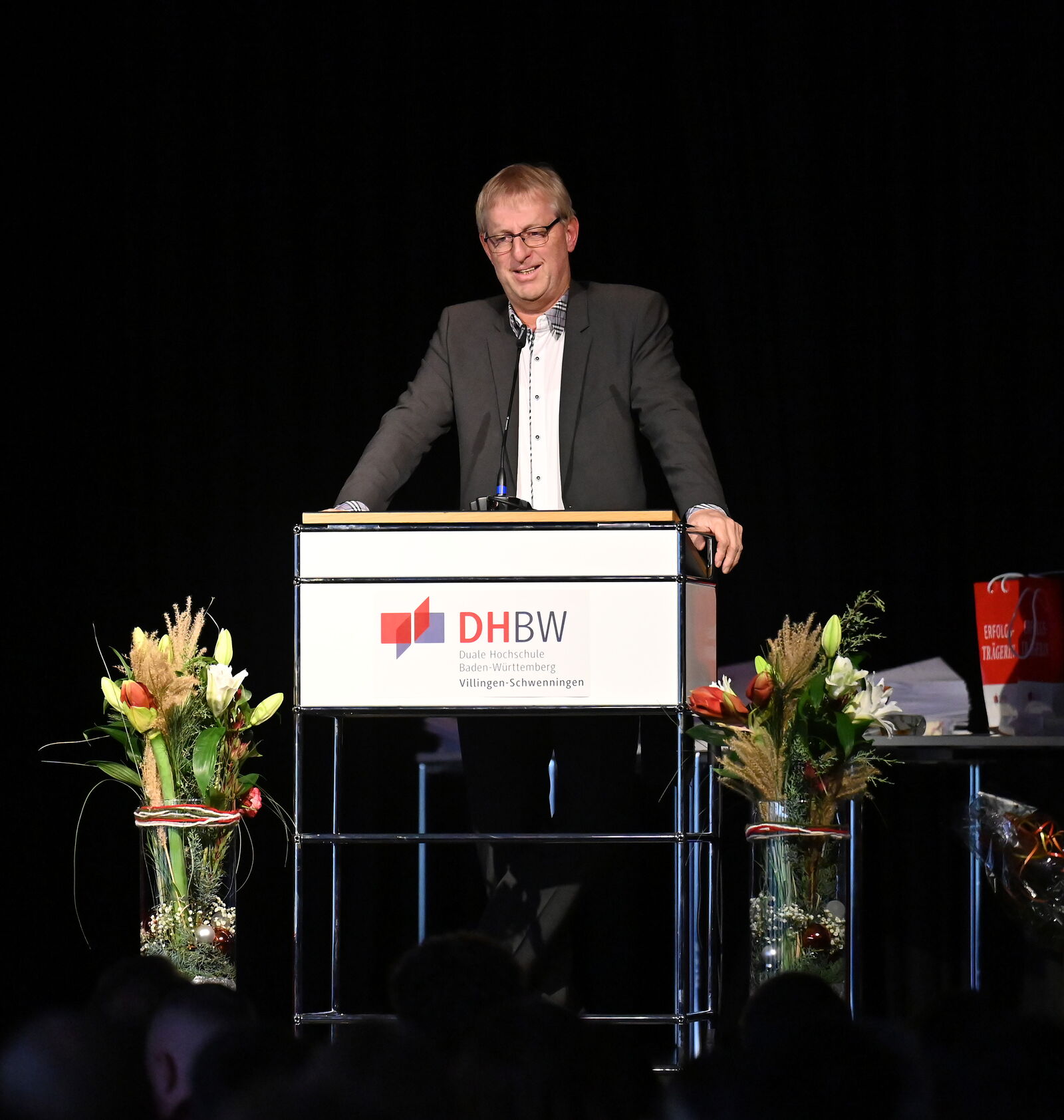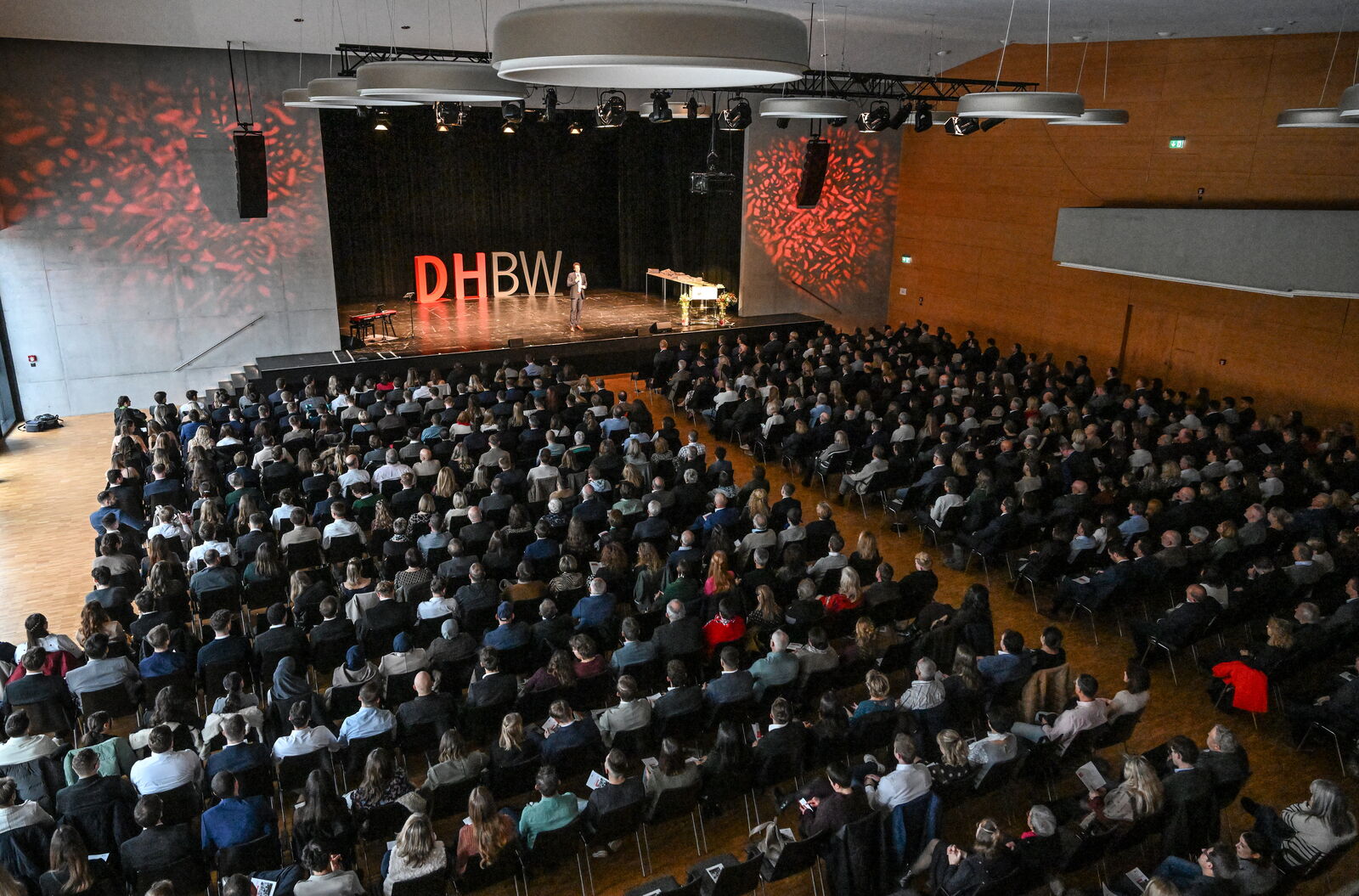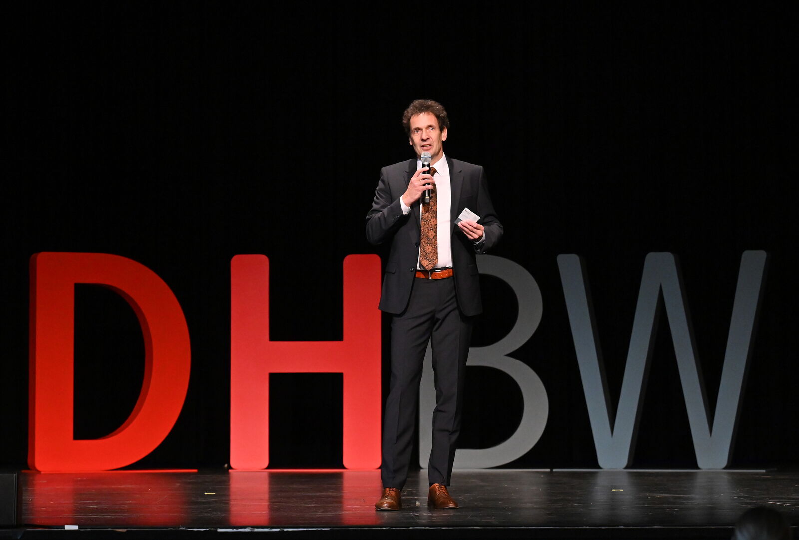 Rektor Prof. Dr.-Ing. Lars Meierling eröffnete die Feierlichkeiten und sprach über Freiheit und Verantwortung. Er rief die ehemaligen Studierenden dazu auf, die Demokratie zu verteidigen: „Führung heißt Leadership – und Freiheit heißt immer auch Verantwortung.“ Zugleich verwies er auf die besondere Bedeutung der DHBW als größte Hochschule des Landes.