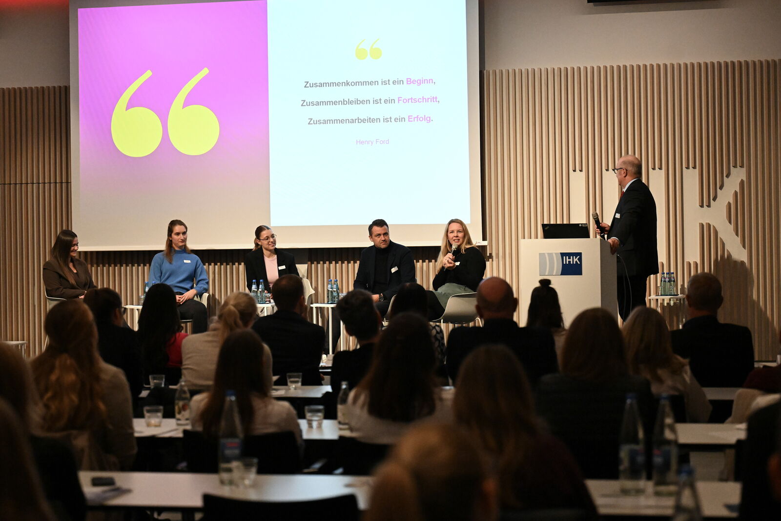 Den Abschluss bildete eine lebendige Podiumsdiskussion mit Prof. Dr. Clive Flynn, Jana Kiesel von der Wirtschaftsinitiative Baden-Württemberg Connected, Pascal Teufel, den DHBW-Studierenden Anne Glaser und Lorena Sieben sowie Karina Pinckert von der IHK. Dabei kam es zum offenen Austausch zwischen den Generationen – manchmal kontrovers, aber immer respektvoll und lösungsorientiert.